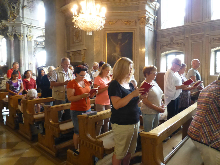 Nach der hl. Messe in der Gnadenkapelle und einer anschließenden Führung durch Pfr. Treutlein ging es weiter Richtung Innenstadt, wo nach dem leckeren Mittagessen und einer gemütlichen Rast im Hofbräu ein weiterer Höhepunkt - die Residenz - auf dem Plan stand. Dieses barocke Monumentalwerk von Balthasar Neumann mit dem Schloss, den Gärten und der Hofkirche wurde für die meisten zur Qual der Wahl. Jeder musste seine Entscheidung treffen. Jedenfalls war bei dem herrlichen Wetter keine Entscheidung falsch. So entschied sich ein Drittel für die Besichtigung des Schlosses, ein Drittel zum Verweilen in den Gärten und der Rest für einen Bummel durch die Stadt. Die fränkischen Cafes verlockten zur gemütlichen Kaffeerunde genauso wie der Dom und das Neumünster zum kurzen Besuch.